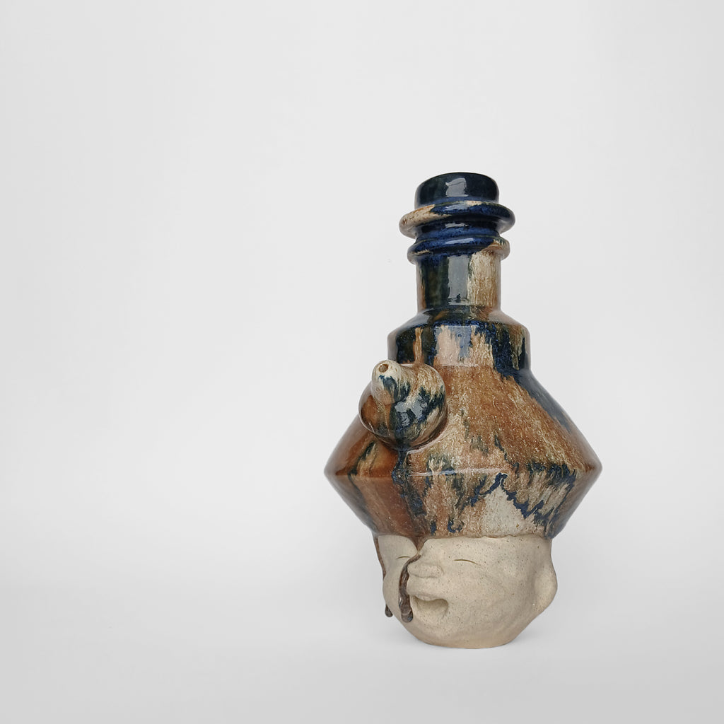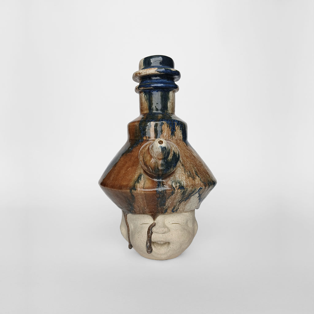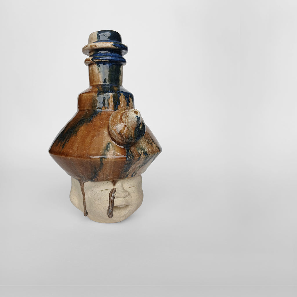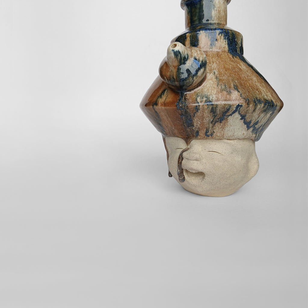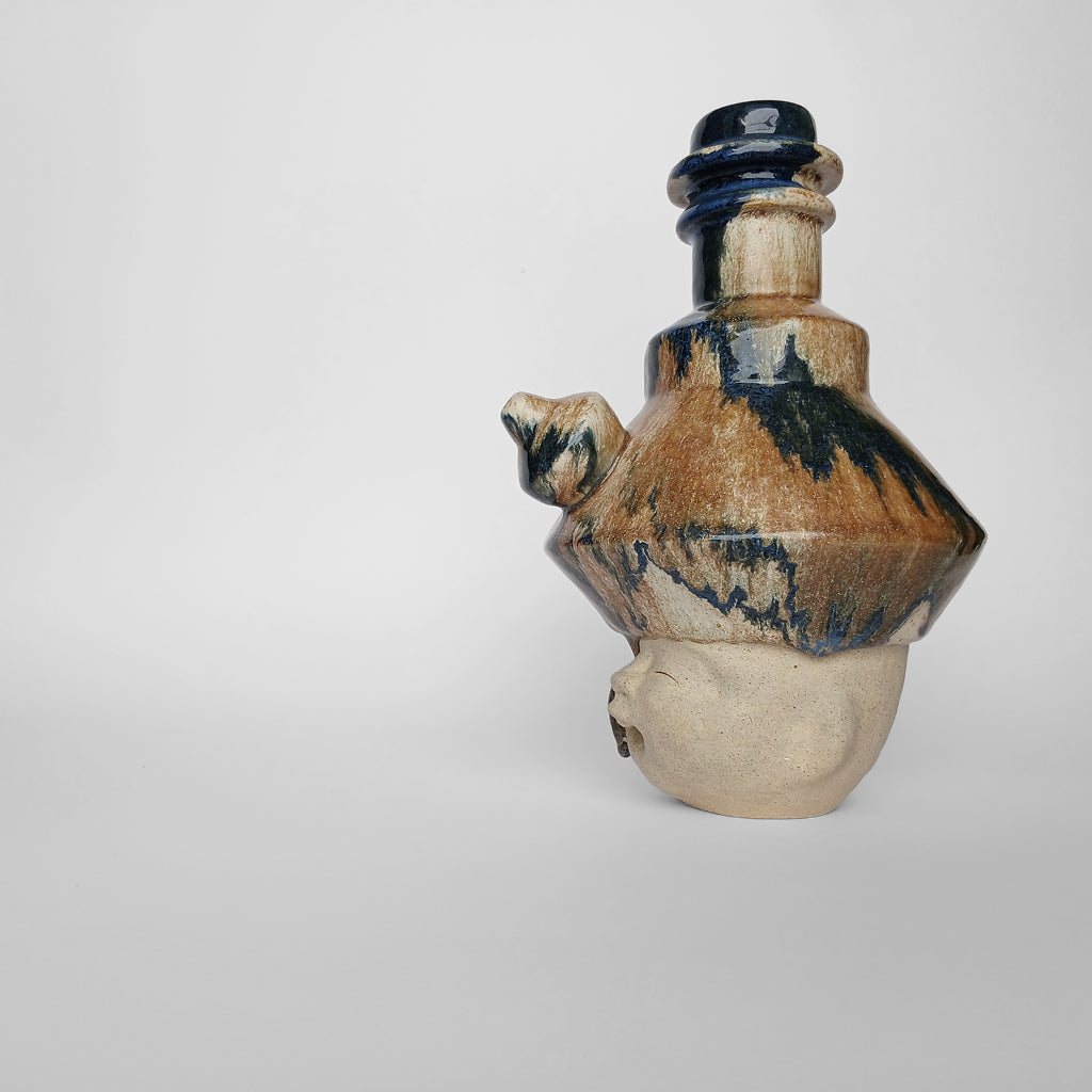 Ceramic Off-white unglazed face Abstract blue-brown glazed head Partly glazed outside, Fully glazed inside Slightly porous, absorbs water 26.5 (H) x 16.5 (W) x 19 (D) cm 2025