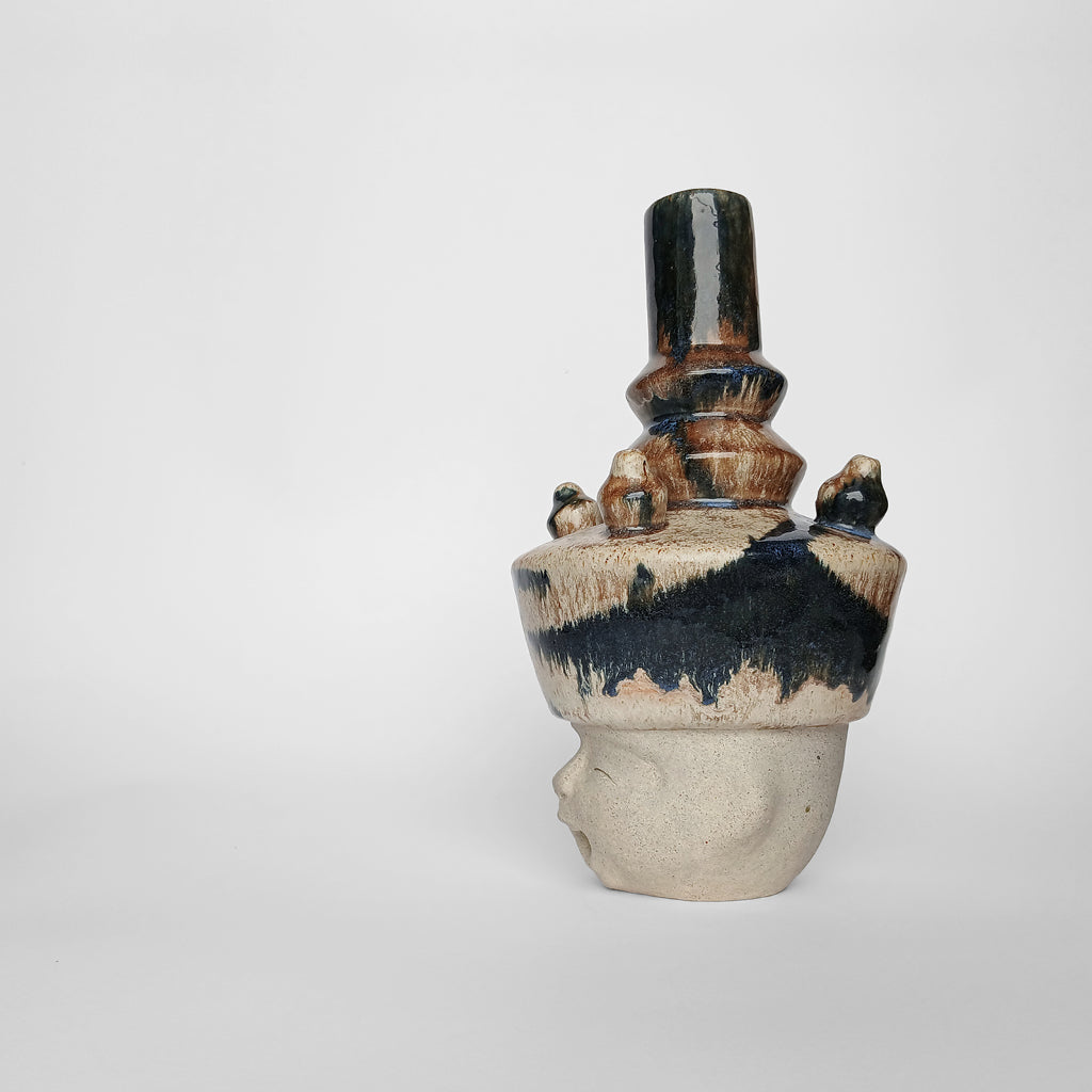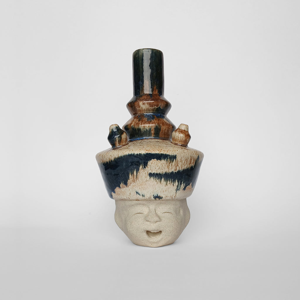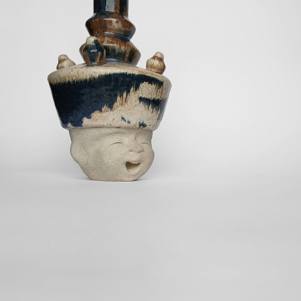 Ceramic Off-white unglazed face Abstract blue-brown glazed head Partly glazed outside, Fully glazed inside Slightly porous, absorbs water 27 (H) x 16 (W) x 16 (D) cm 2025